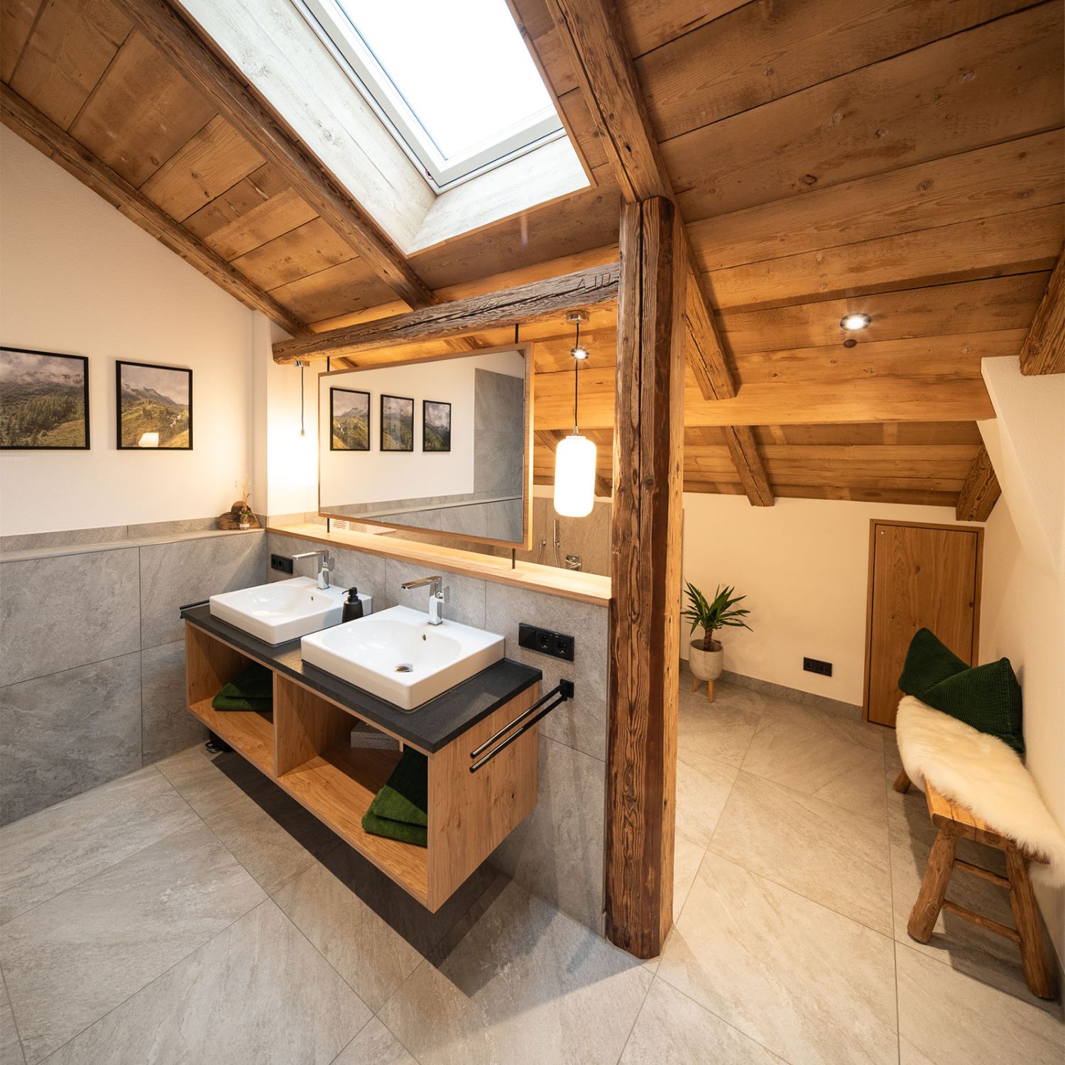 - Großes Badezimmer mit begehbarer Dusche, Badewanne, WC sowie integrierter Sauna – ideal für entspannte Wellnesstage