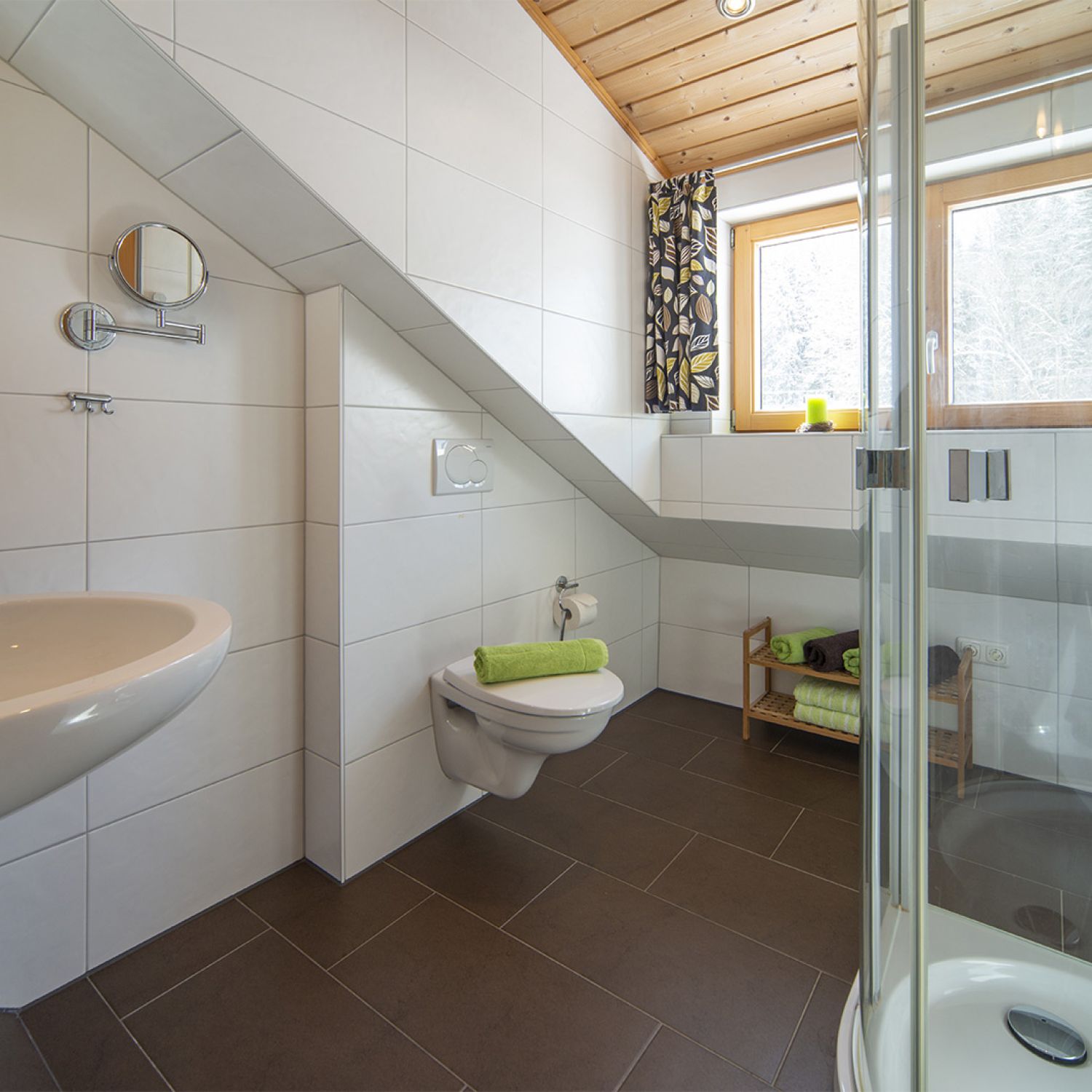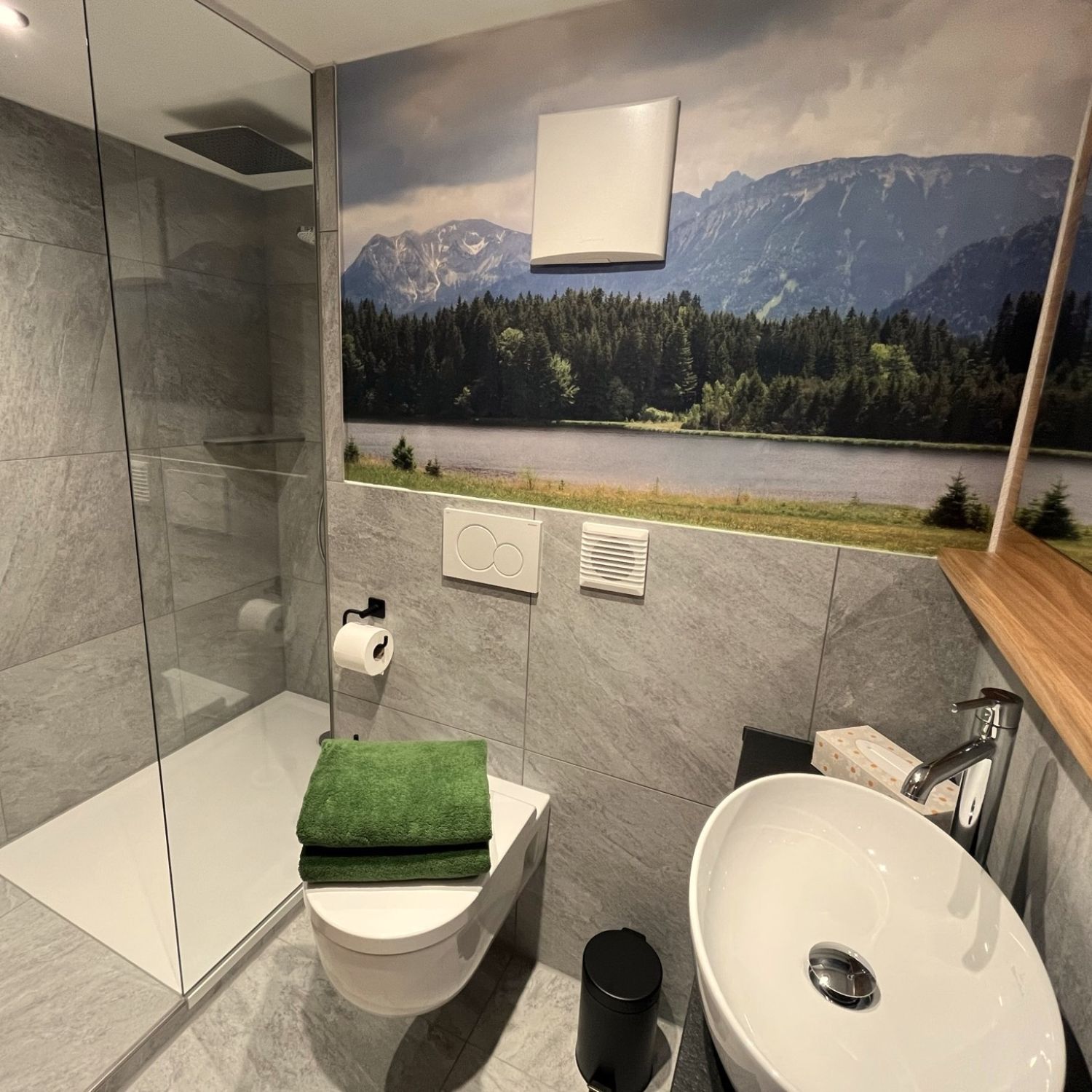 - Badezimmer mit Dusche, WC, flauschigen Handtüchern und Haartrockner