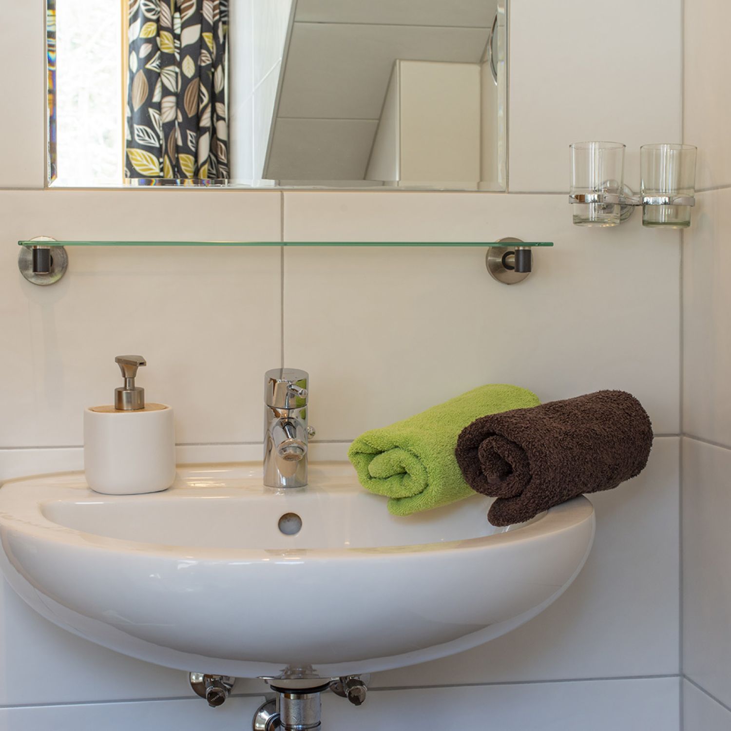 - Kleines Bad mit begehbarer Dusche und WC – praktisch und funktional