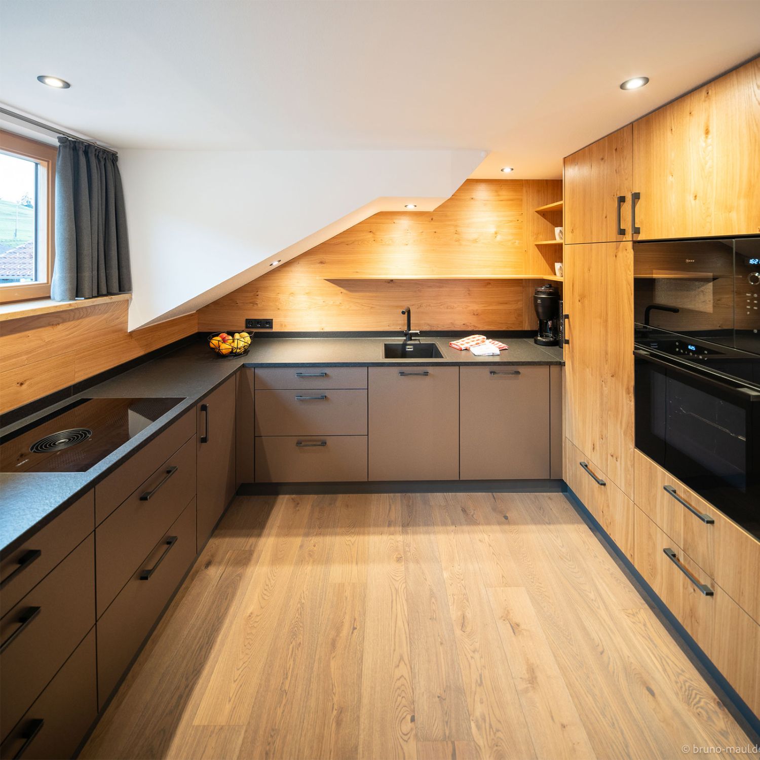 - Offene, moderne Küche – komplett ausgestattet für gemeinsame Kochmomente (Spülmaschine, Cerankochfeld, Backofen, Kühlschrank mit Gefrierfach, Kaffeemaschine, Wasserkocher, Toaster, Handmixer, Backzubehör, Geschirr, Besteck, Töpfe, Schüsseln und eine Auswahl an Gewürzen)
